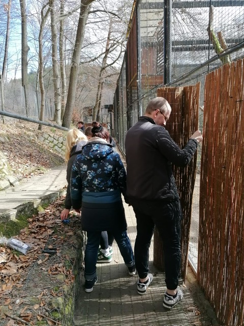 Część zespołu zaangażowała się w prace przy zapleczu wolier ptaków, wspierając opiekunów przy wymianie mat bambusowych. To jeden z elementów dbania o przestrzeń, w której przebywają zwierzęta – regularnie odnawiany i wymagający sporo pracy.